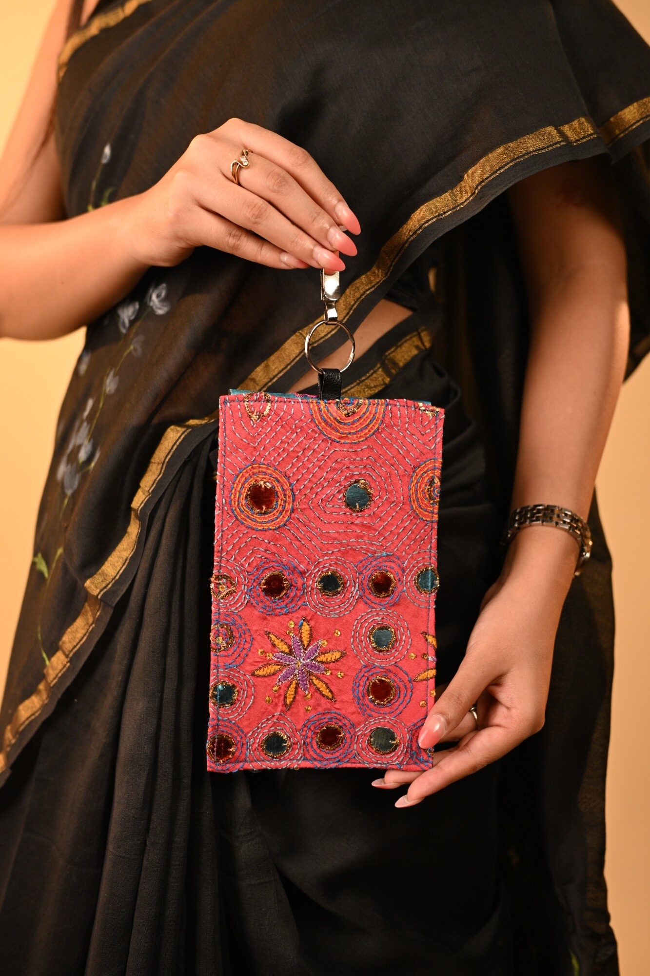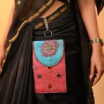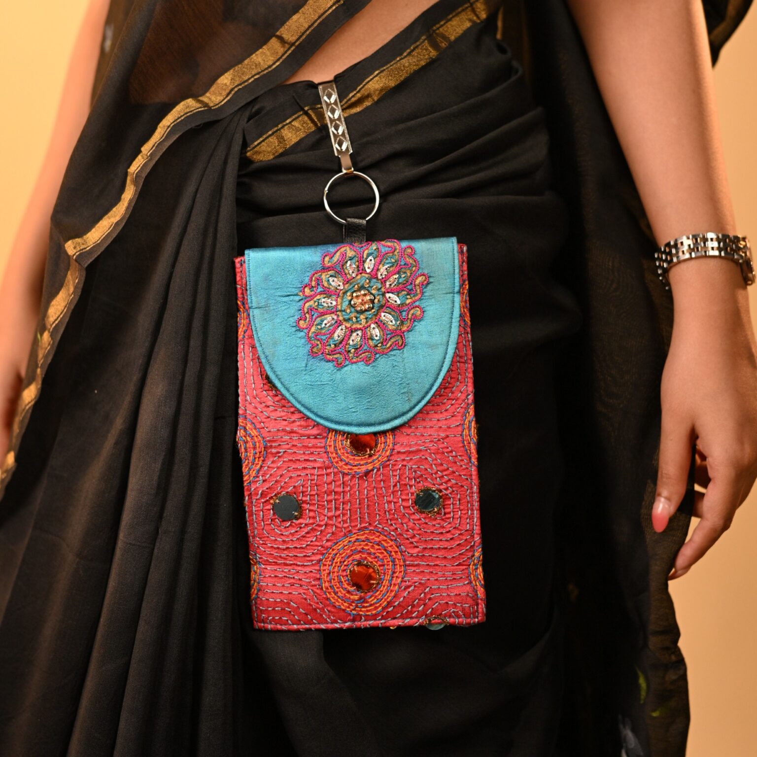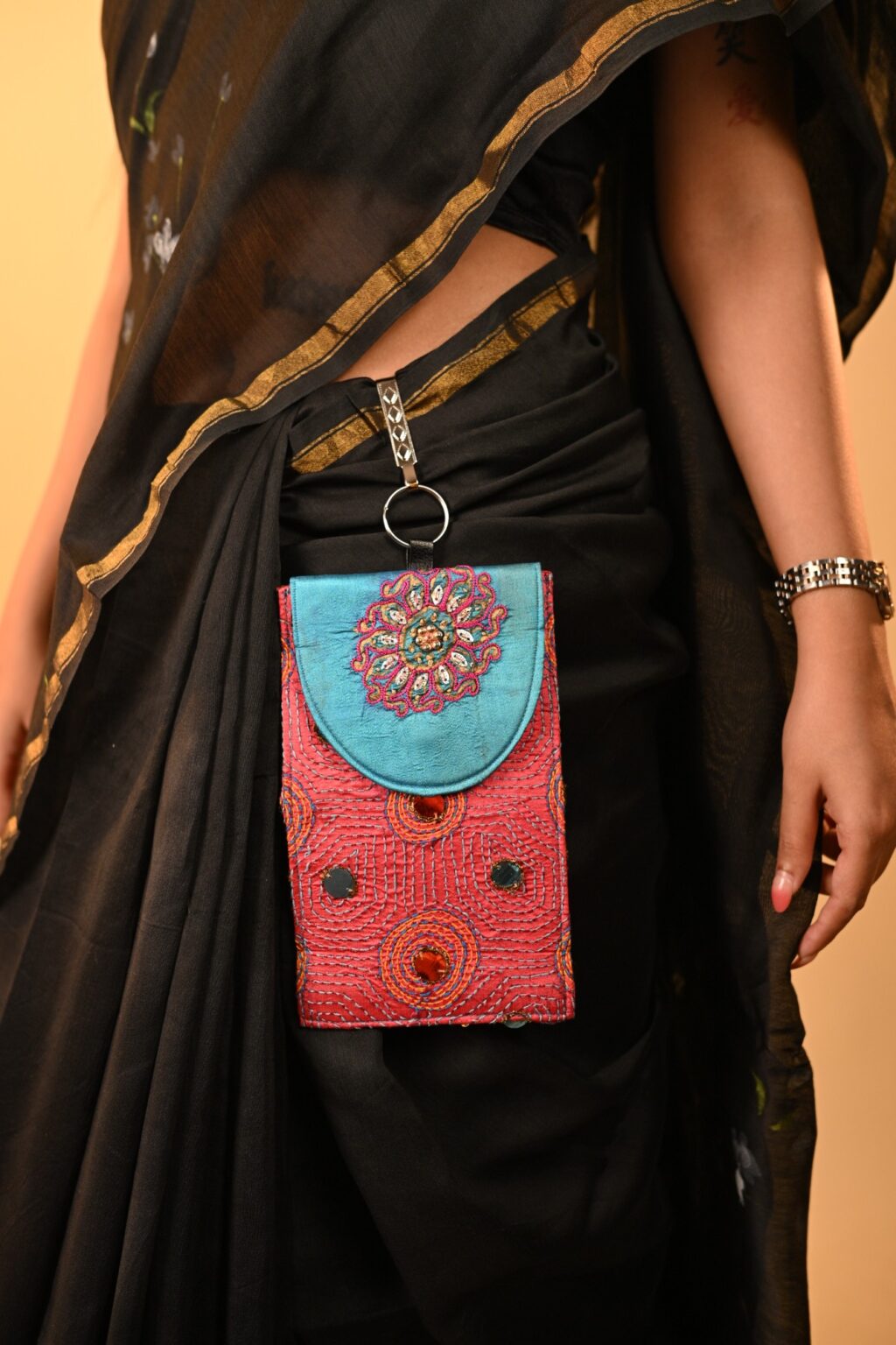 This waist features gorgeous embroidery bag which can hold your phone or essentials. Go hands free with our saree pouch.