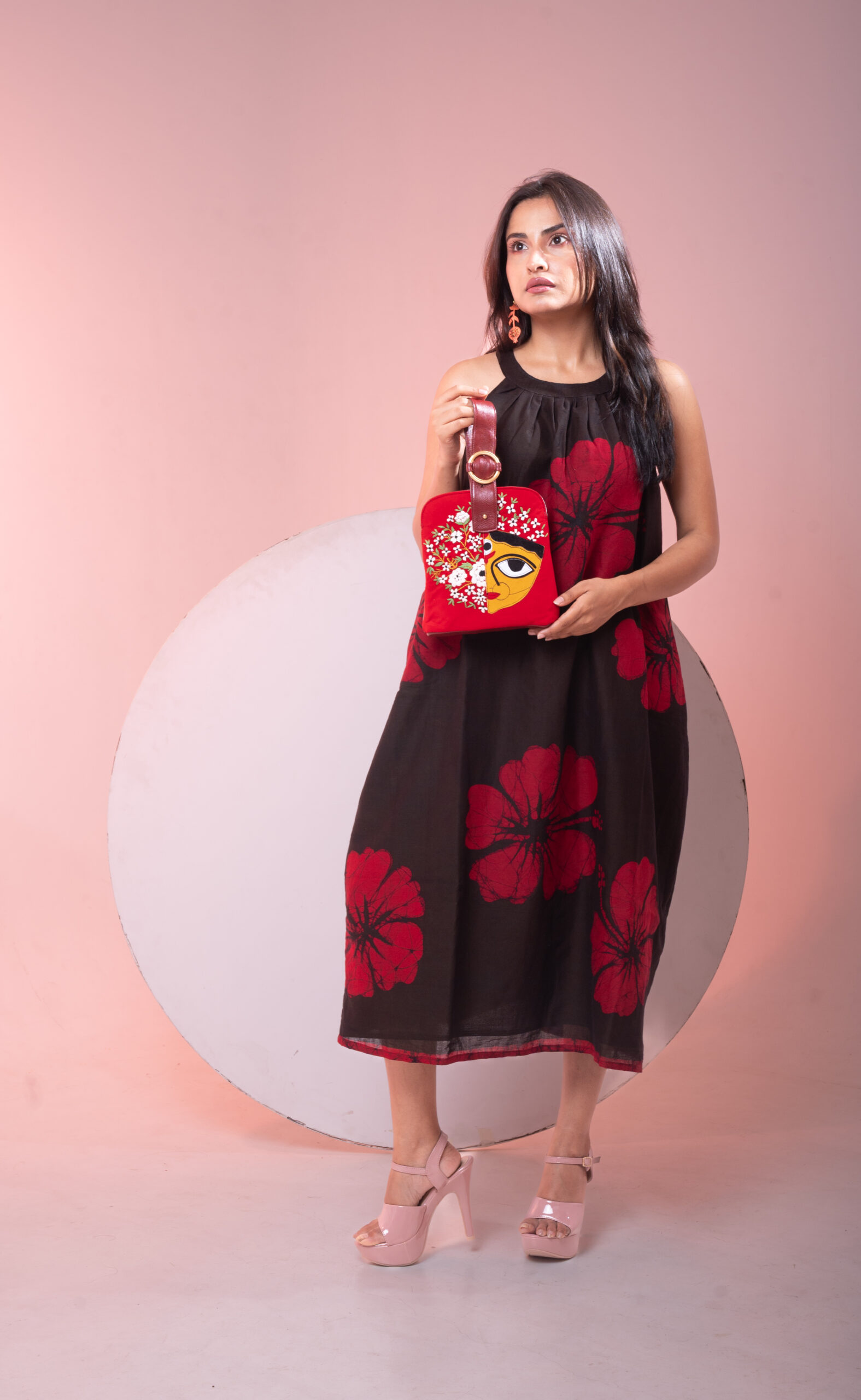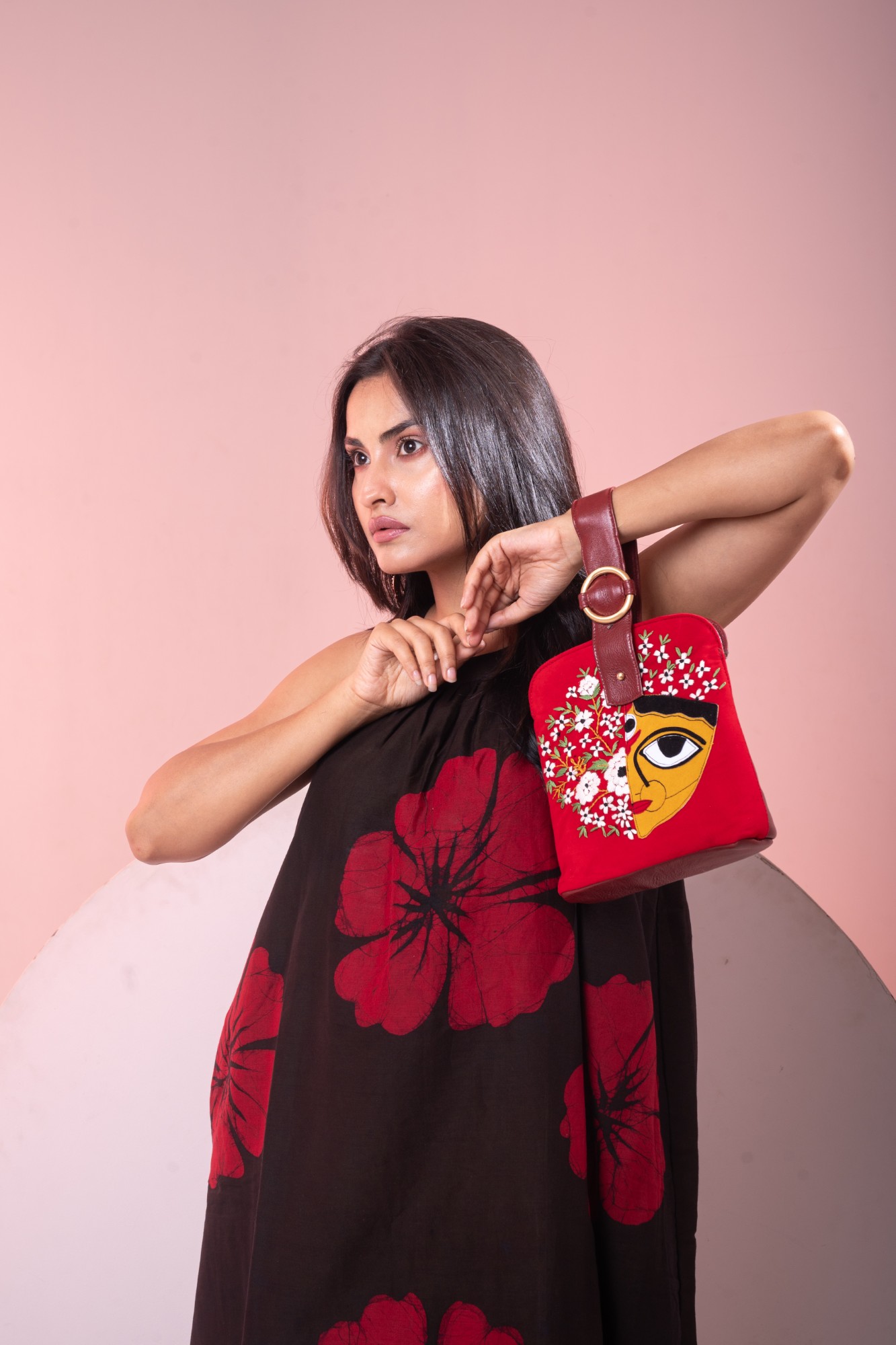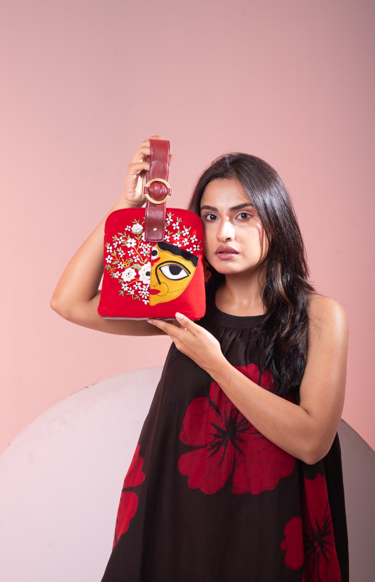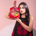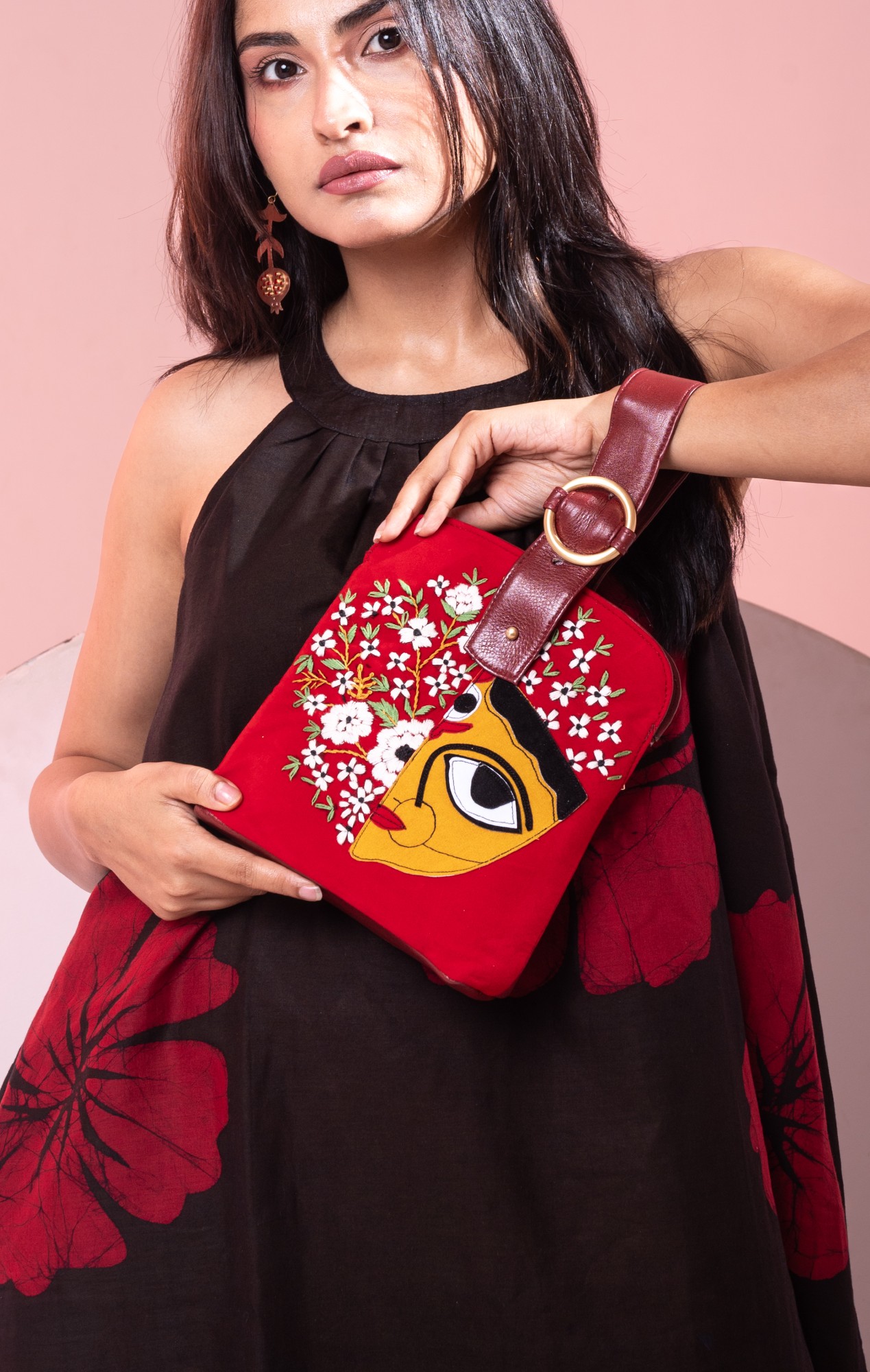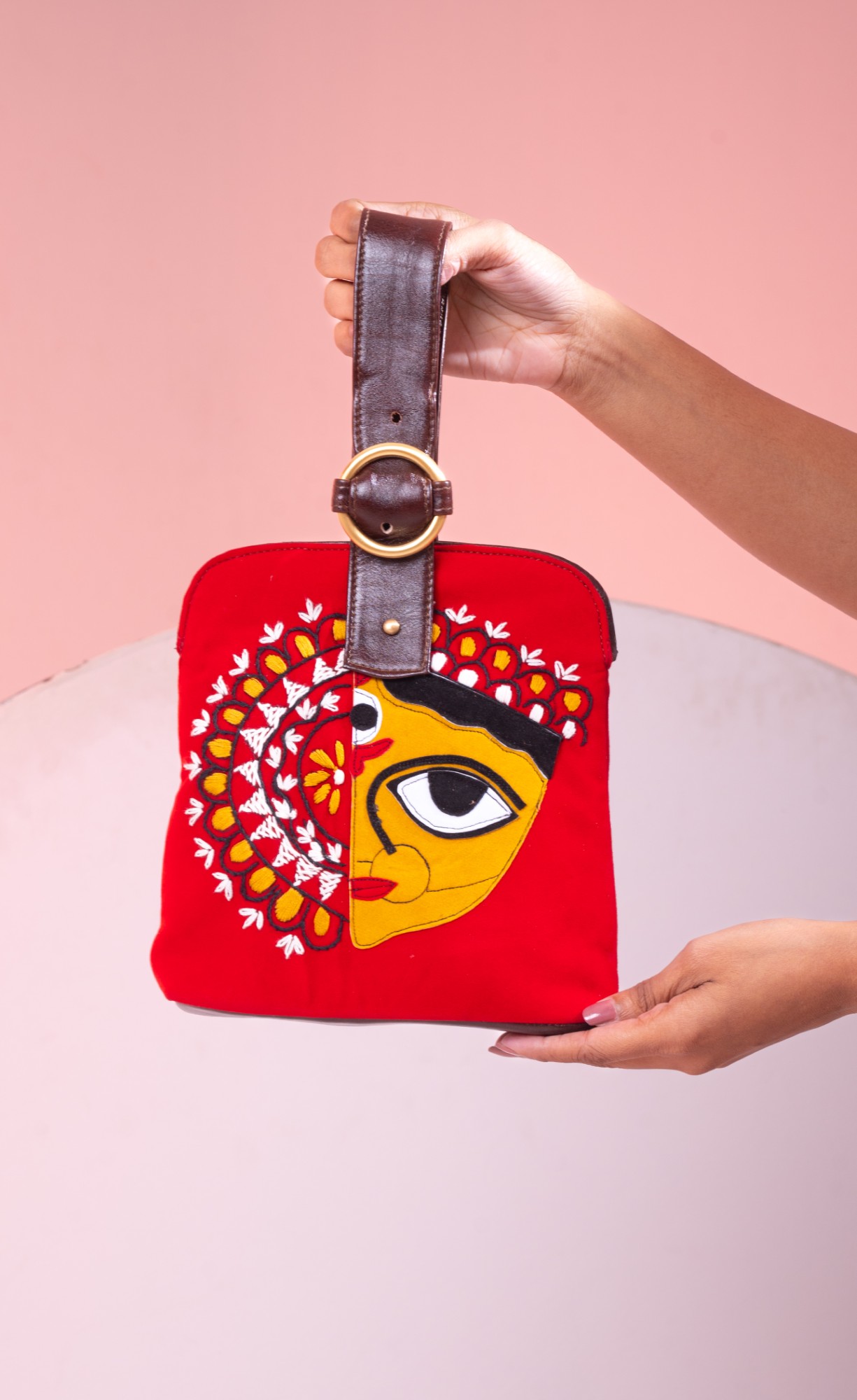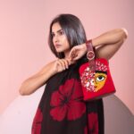 This evening bag features Maa Durga patchwork and hand embroidery with magnetic closure at top. This bag has embroidery on front and a pure leather back. The handle strap is pure leather with one zipper pocket inside and one at the back. It is easy to carry with the adjustable wristlet leather strap.