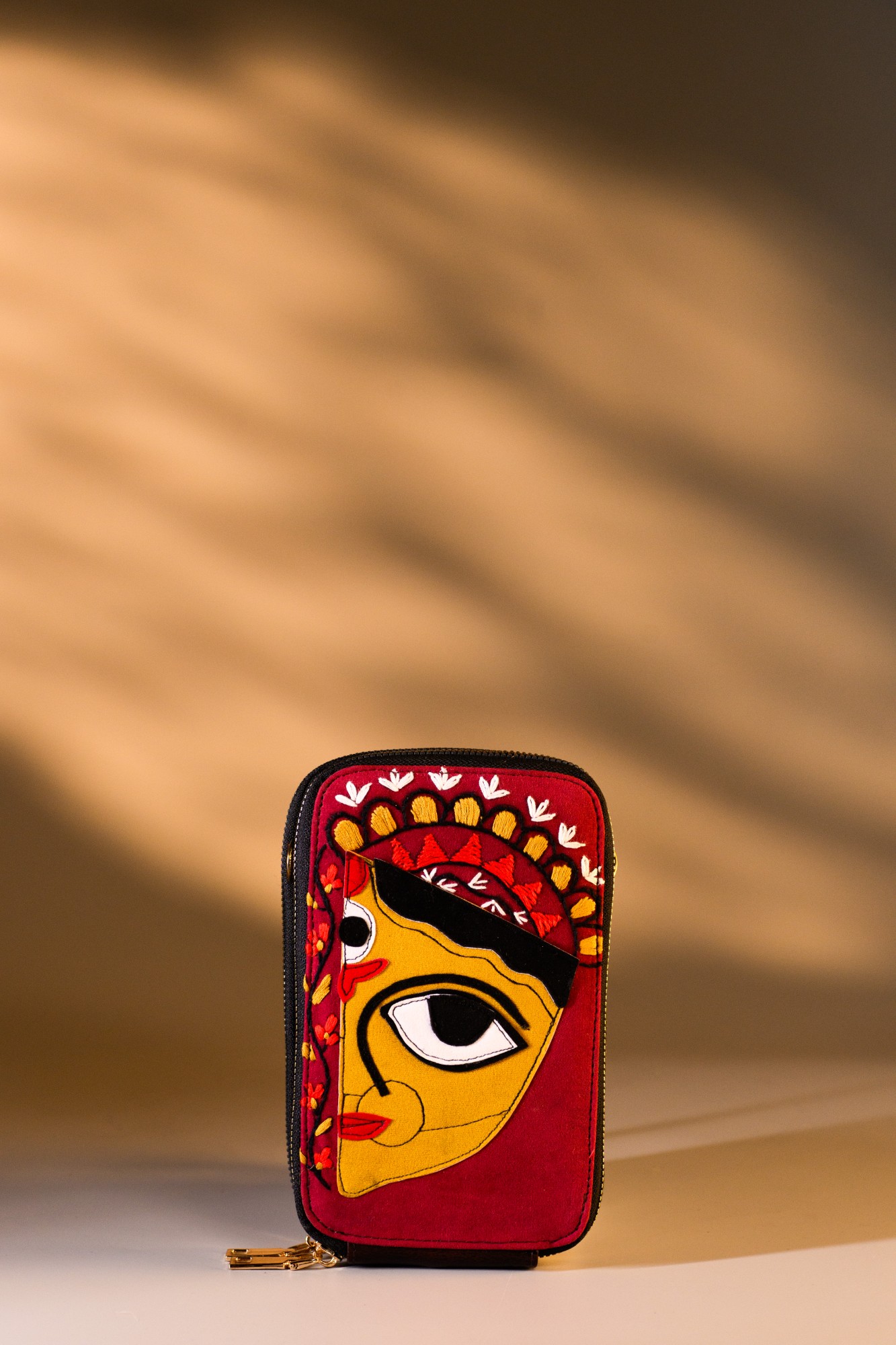 This unique wallet features Devi Durga colourful patch work. Its sleek, compact design includes 2 zippers with 2 unique accordion style compartments each, with card slots, back pocket and space for essentials like your phones, sunglasses, cards, keys, and cash. Equipped with a removable strap, it can be worn as a crossbody, shoulder bag, or clutch for any occasion.
