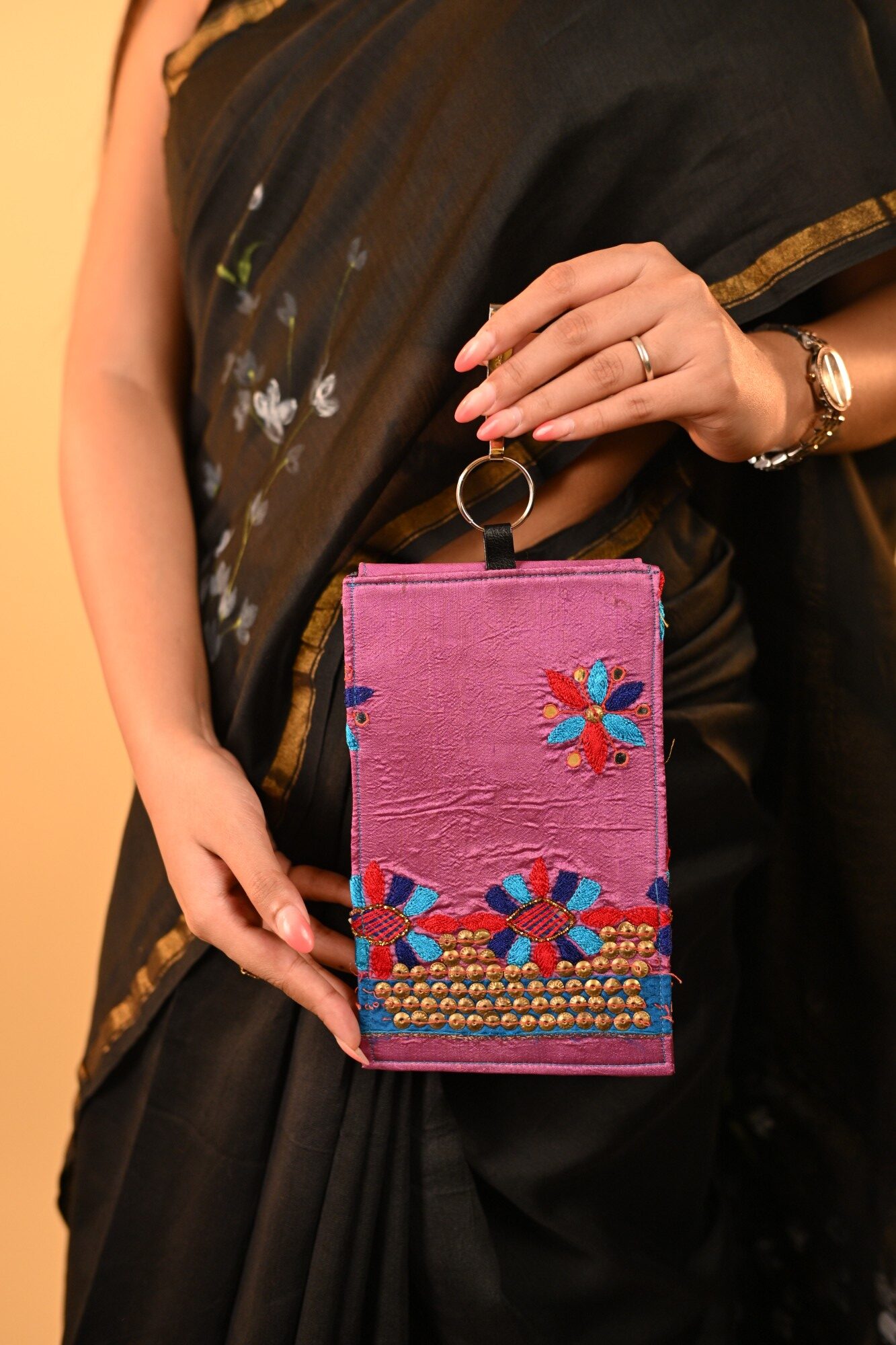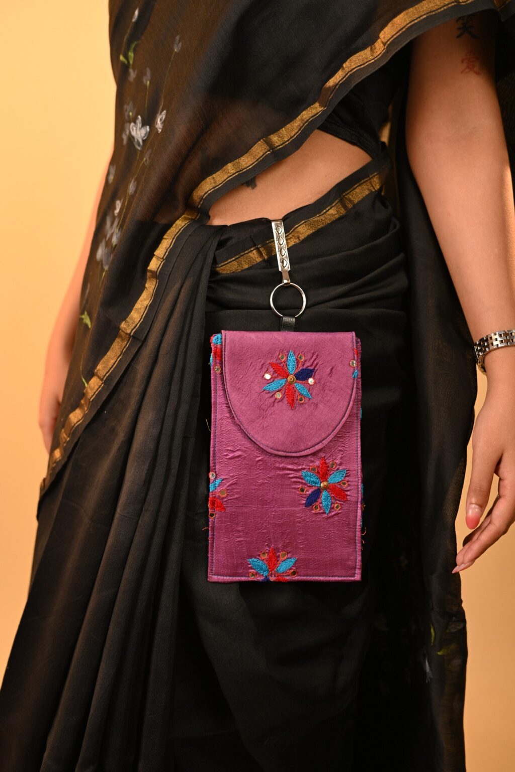 This waist features gorgeous embroidery bag which can hold your phone or essentials. Go hands free with our saree pouch.