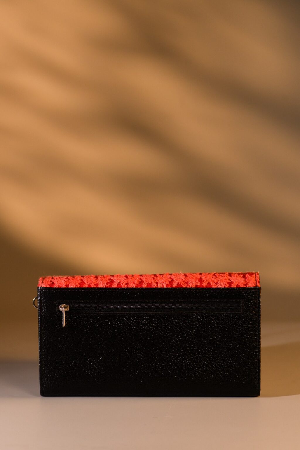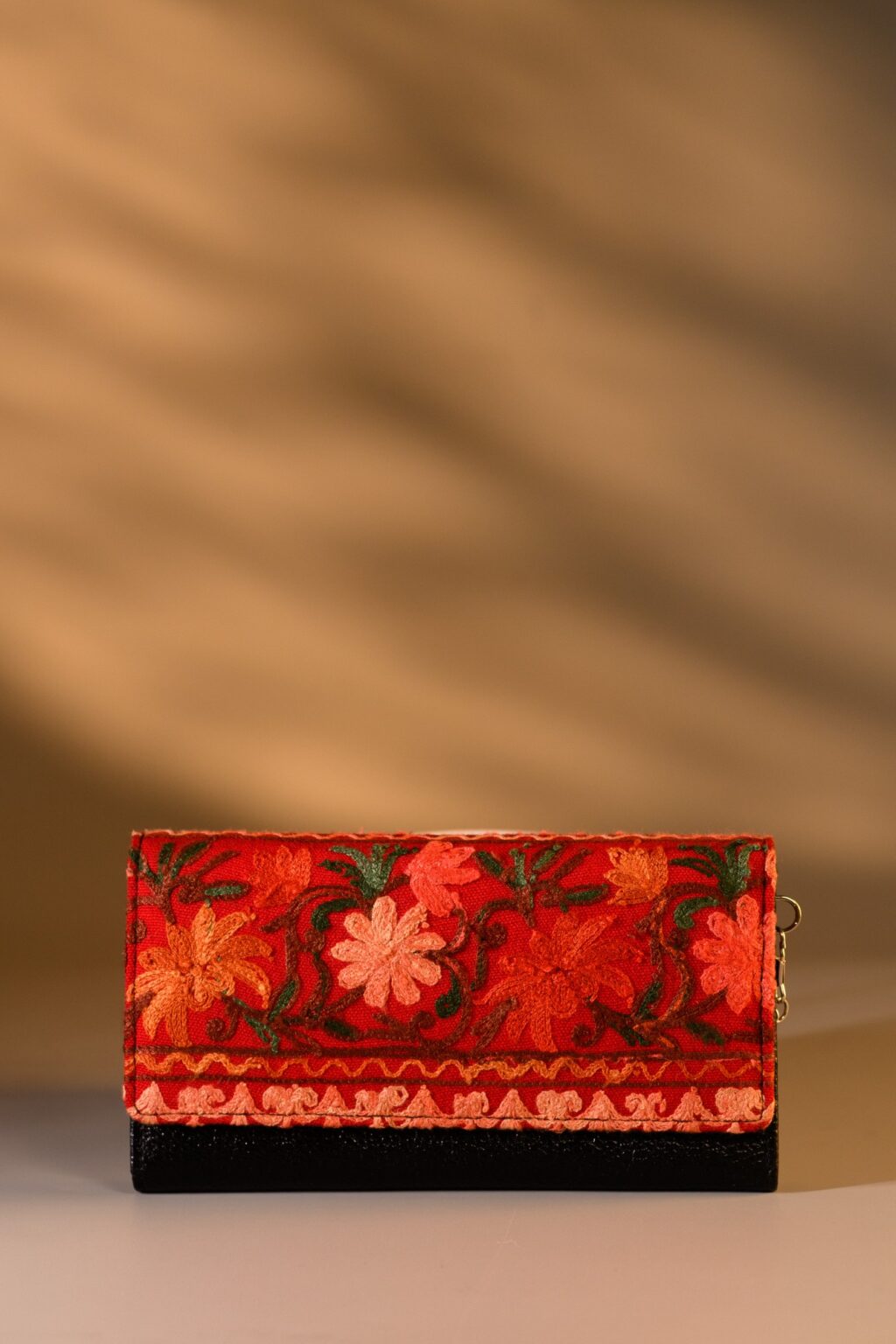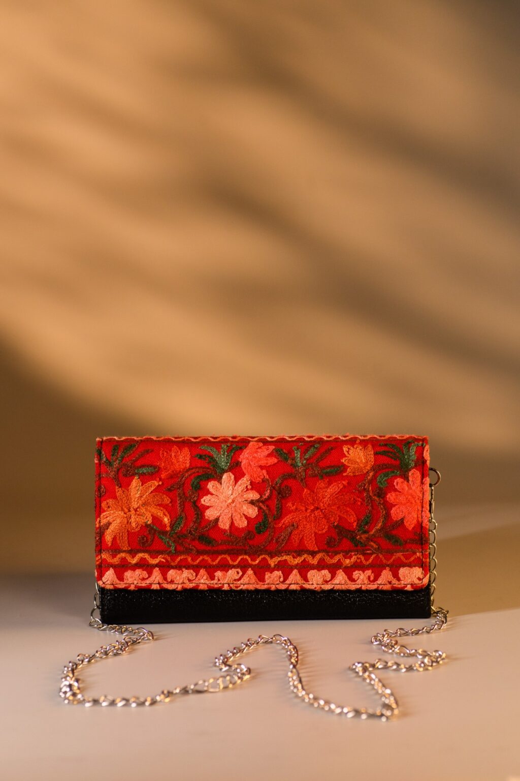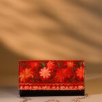 This unique wallet features kashmiri embroidery. Its sleek, compact design includes 2 zippers with 3 compartments, with card slots, back zipper pocket and space for essentials. This spacious wallet can hold your smartphone and enclose it. Equipped with a removable chain, it can be worn as a crossbody, shoulder bag, or clutch for any occasion.