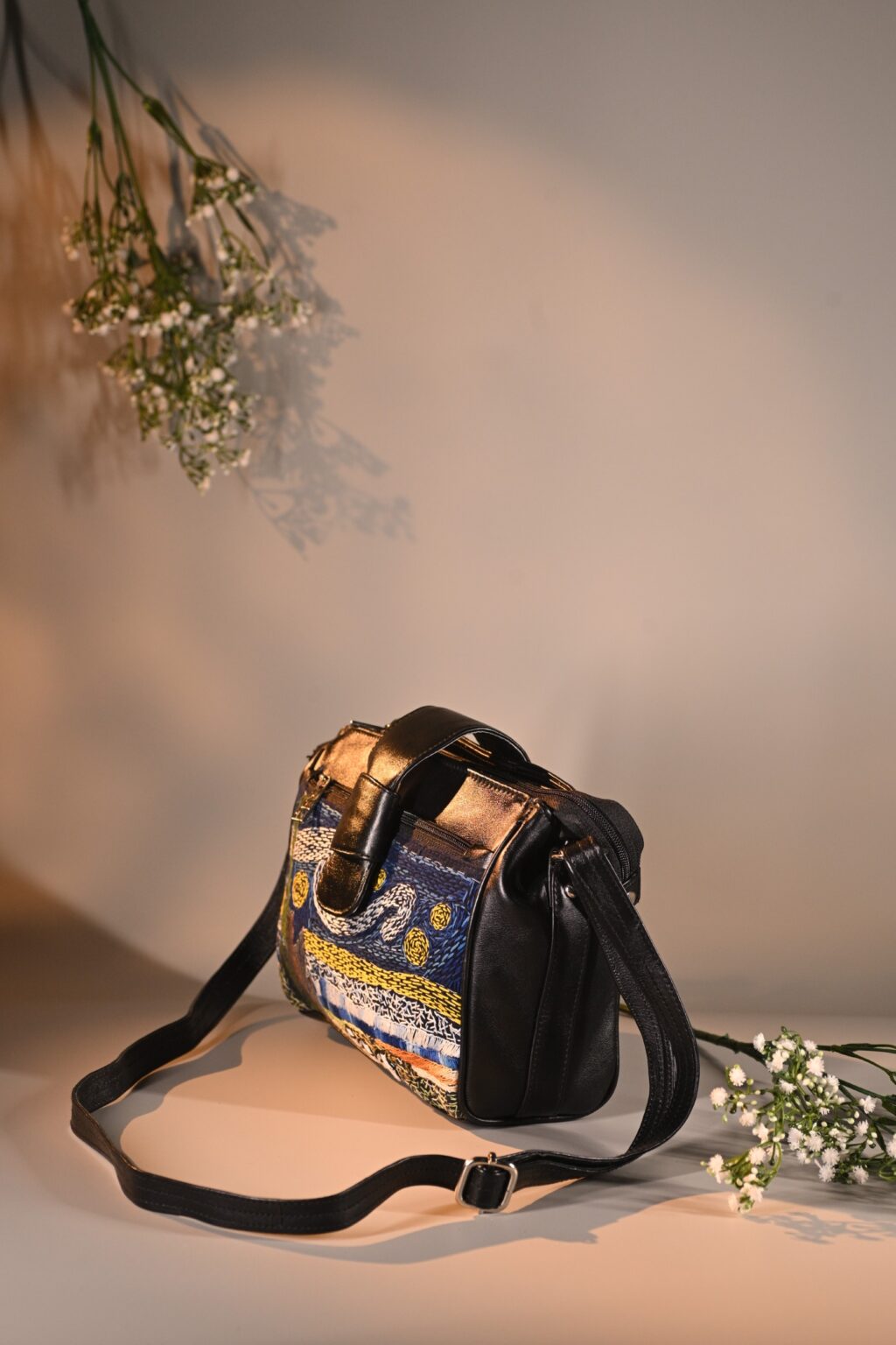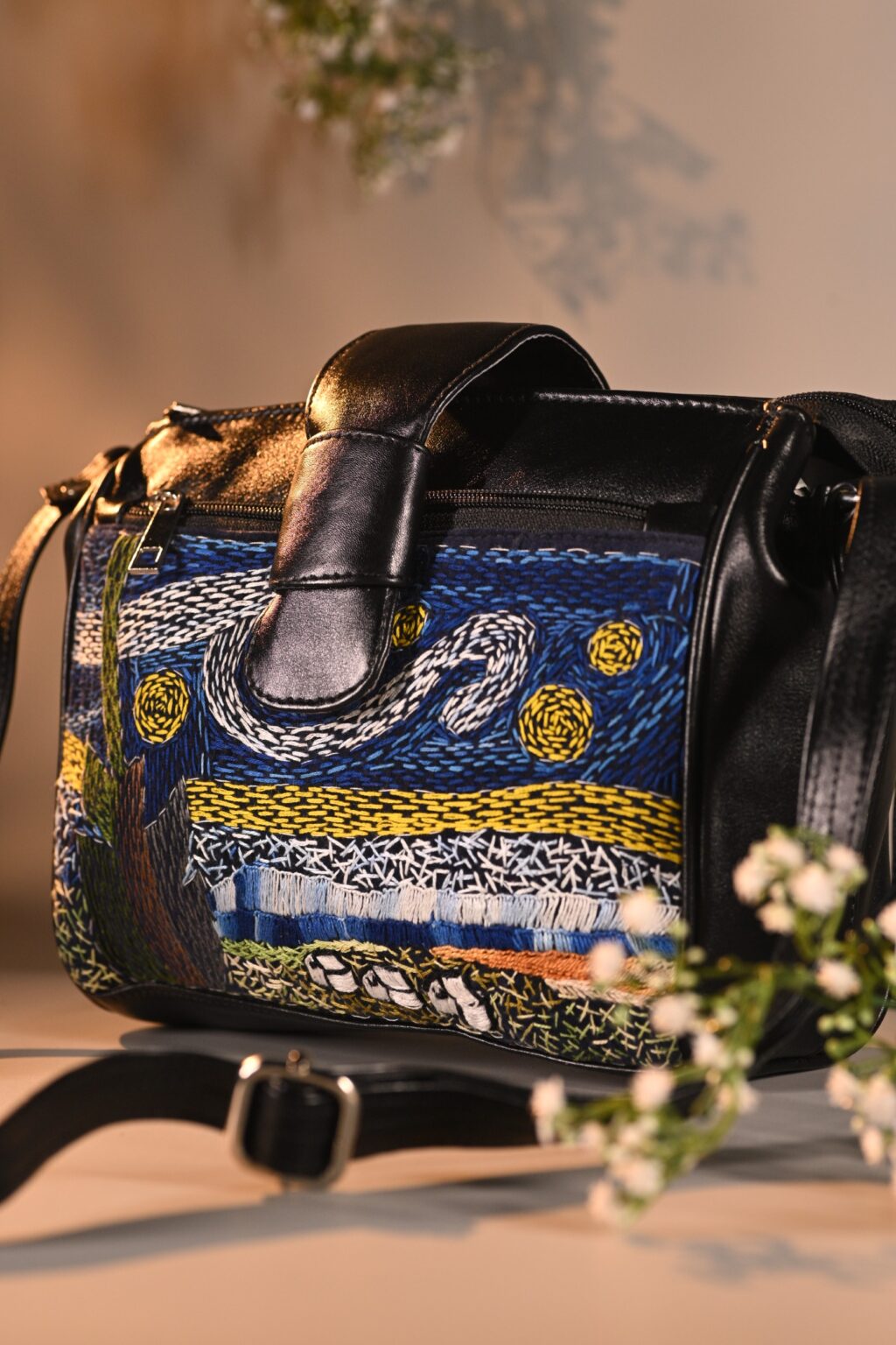 This unique mini sling bag features a Van Gogh’s iconic Starry Night handembroidered artwork. Its sleek, compact design includes 1 main zipper closure with 2 partitions, 2 inside hidden zipper pockets, 1 front zipper pocket, 1 back zipper pocket and space for essentials like your phone, cosmetics, small umbrella, water bottle and cash. Equipped with a removable strap, it can be worn as a crossbody, shoulder bag, or clutch for any occasion.