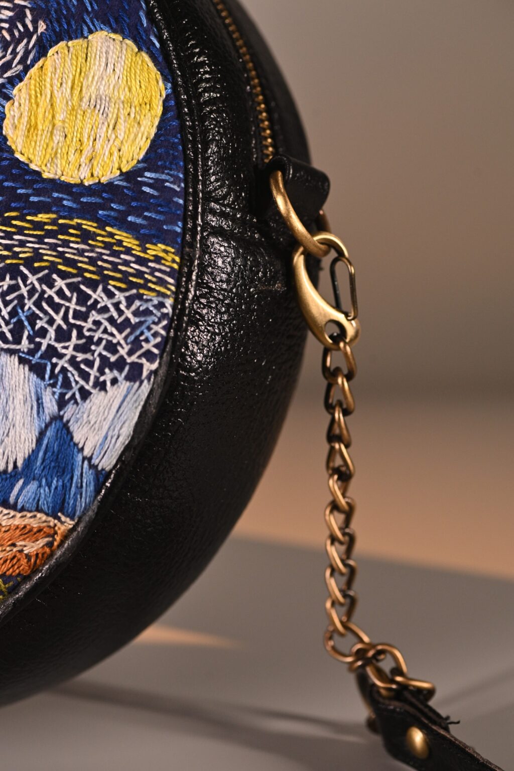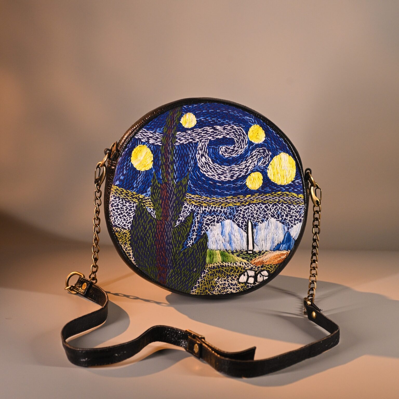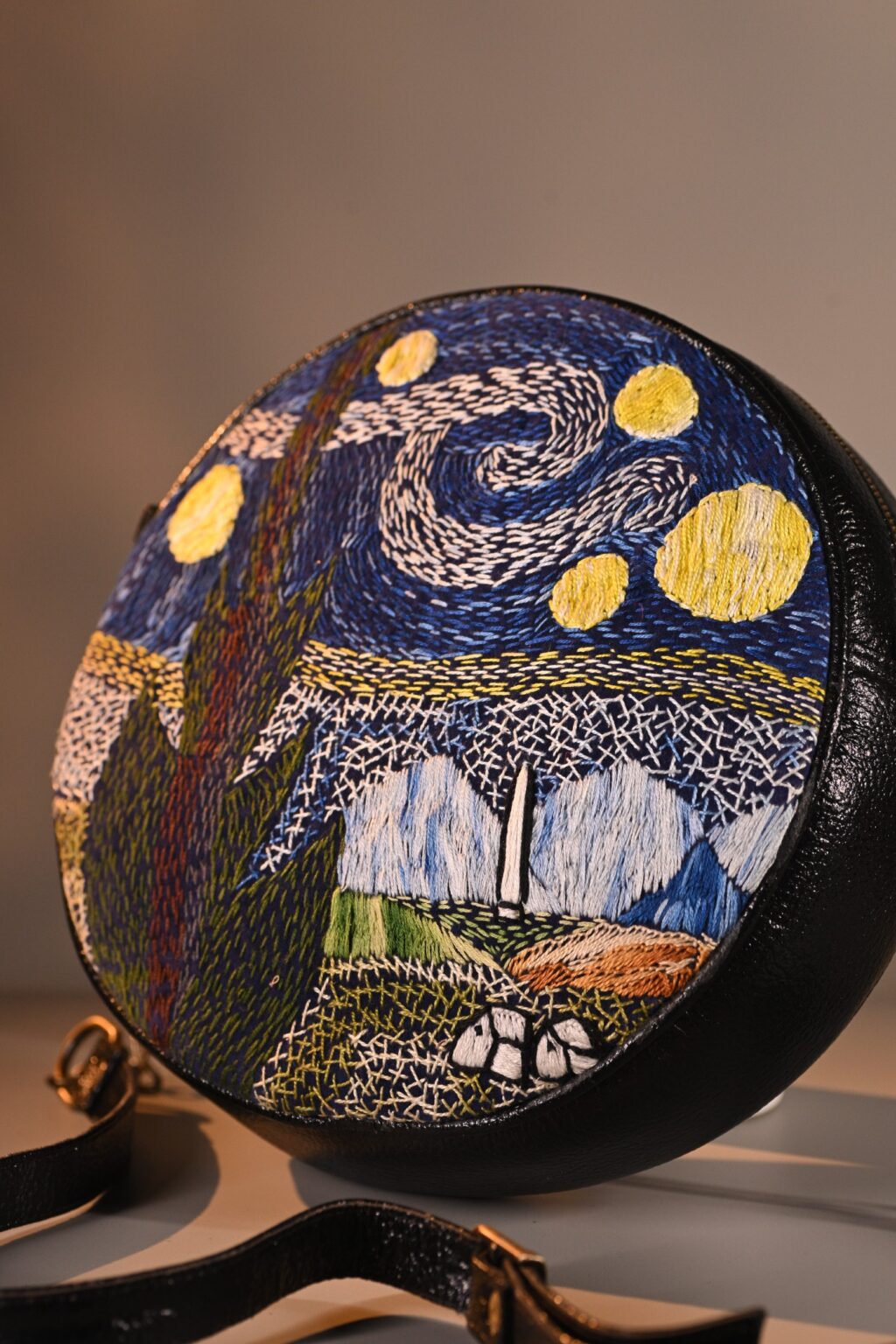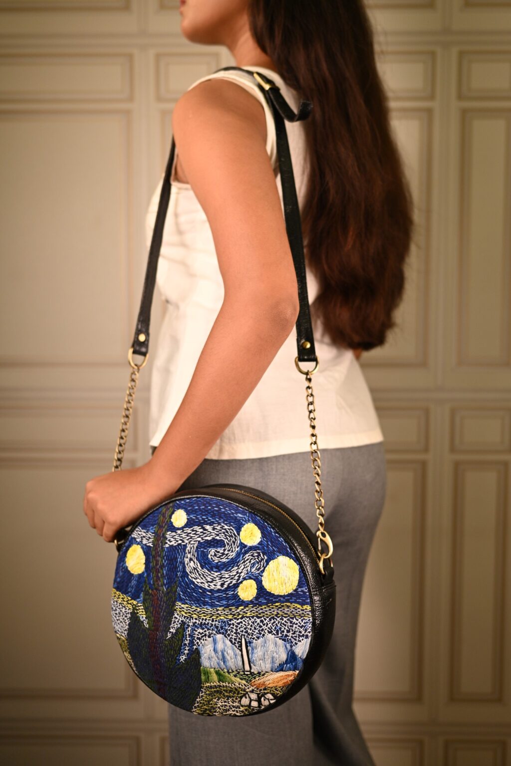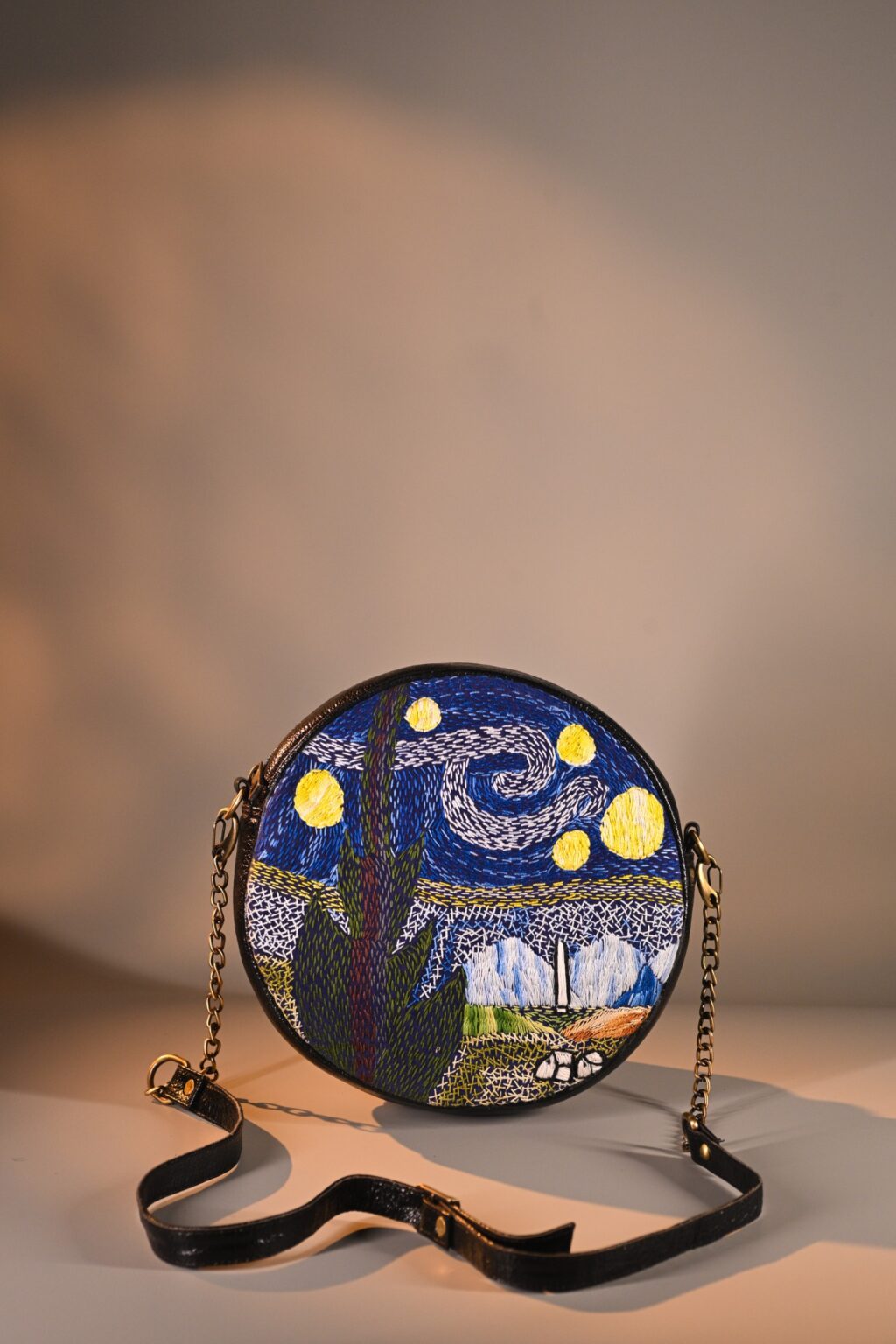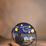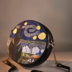 This unique mini sling bag features a Van Gogh’s iconic Starry Night handembroidered artwork. Its sleek, compact design includes 1 zipper, 1 inside zipper