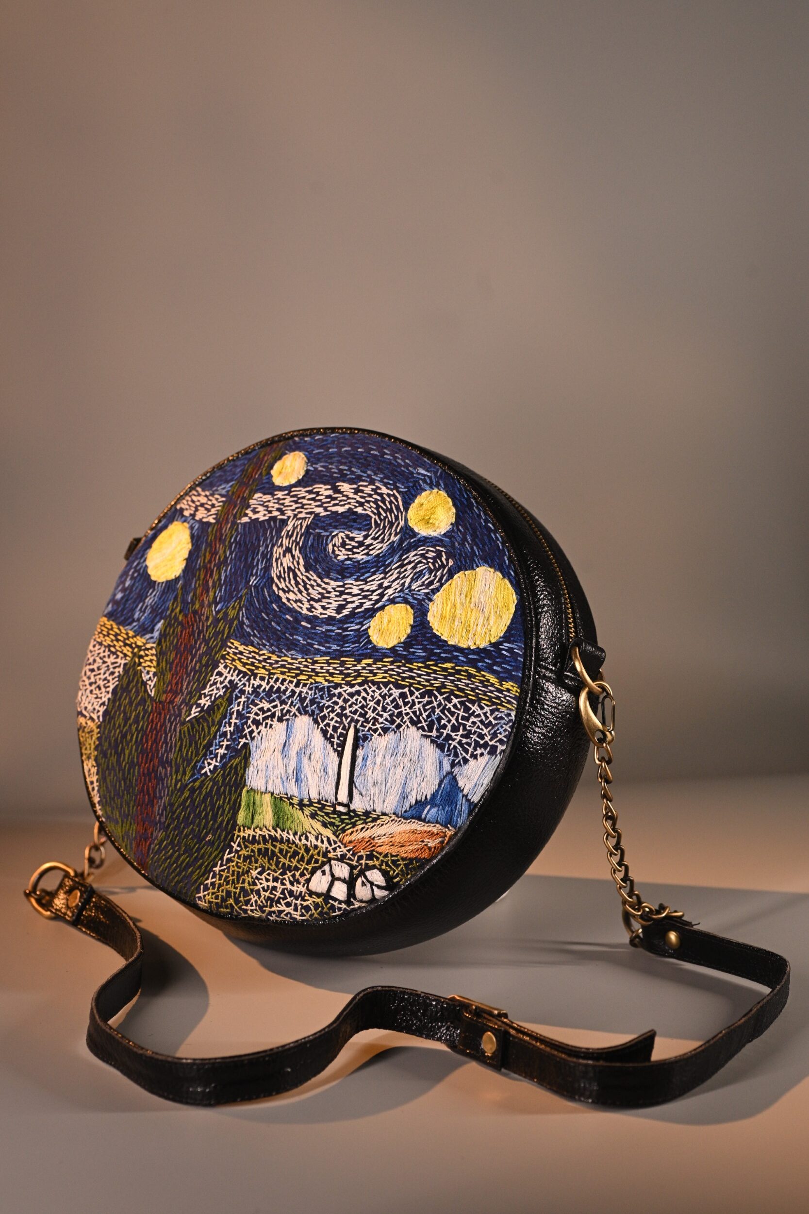 This unique mini sling bag features a Van Gogh’s iconic Starry Night handembroidered artwork. Its sleek, compact design includes 1 zipper, 1 inside zipper