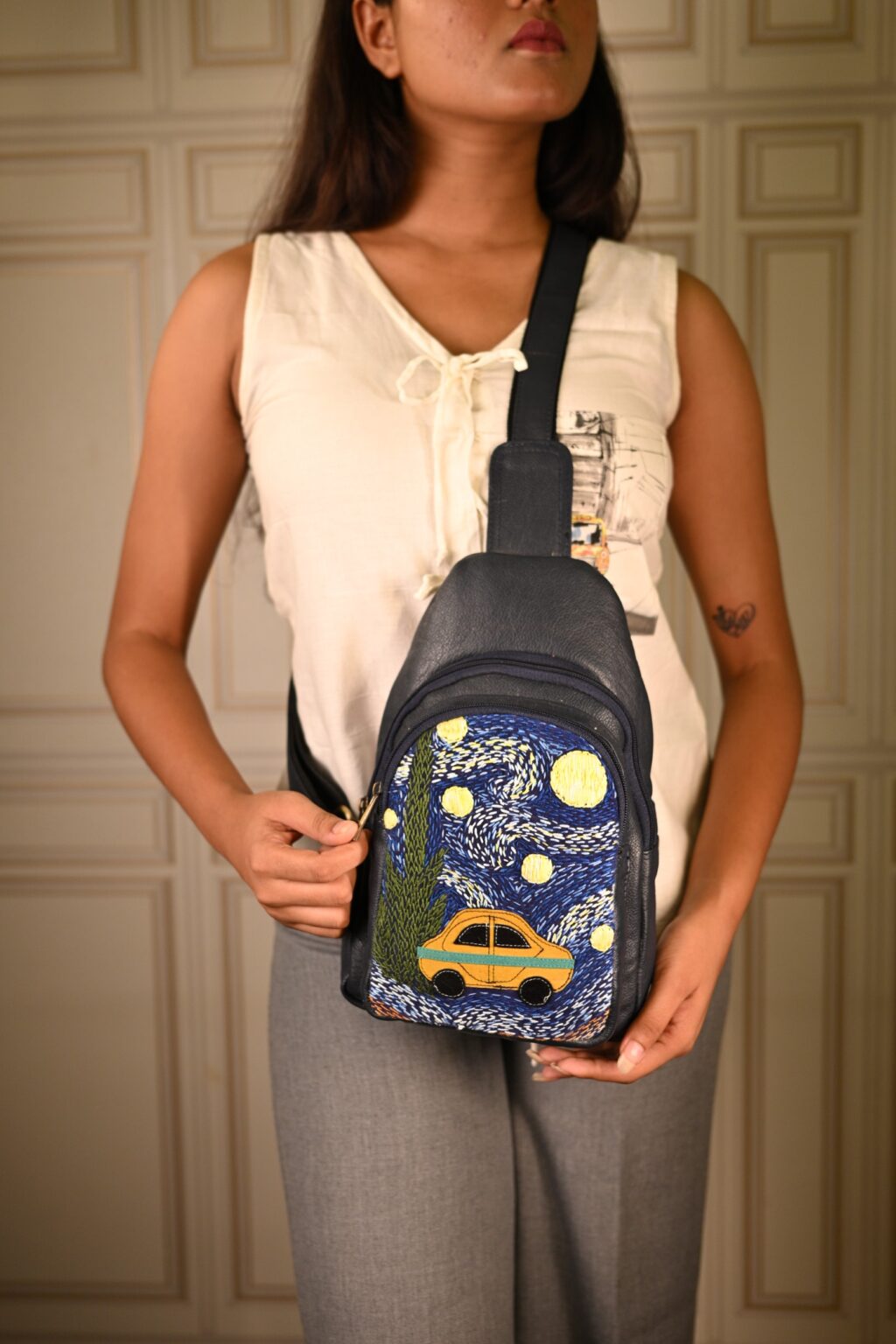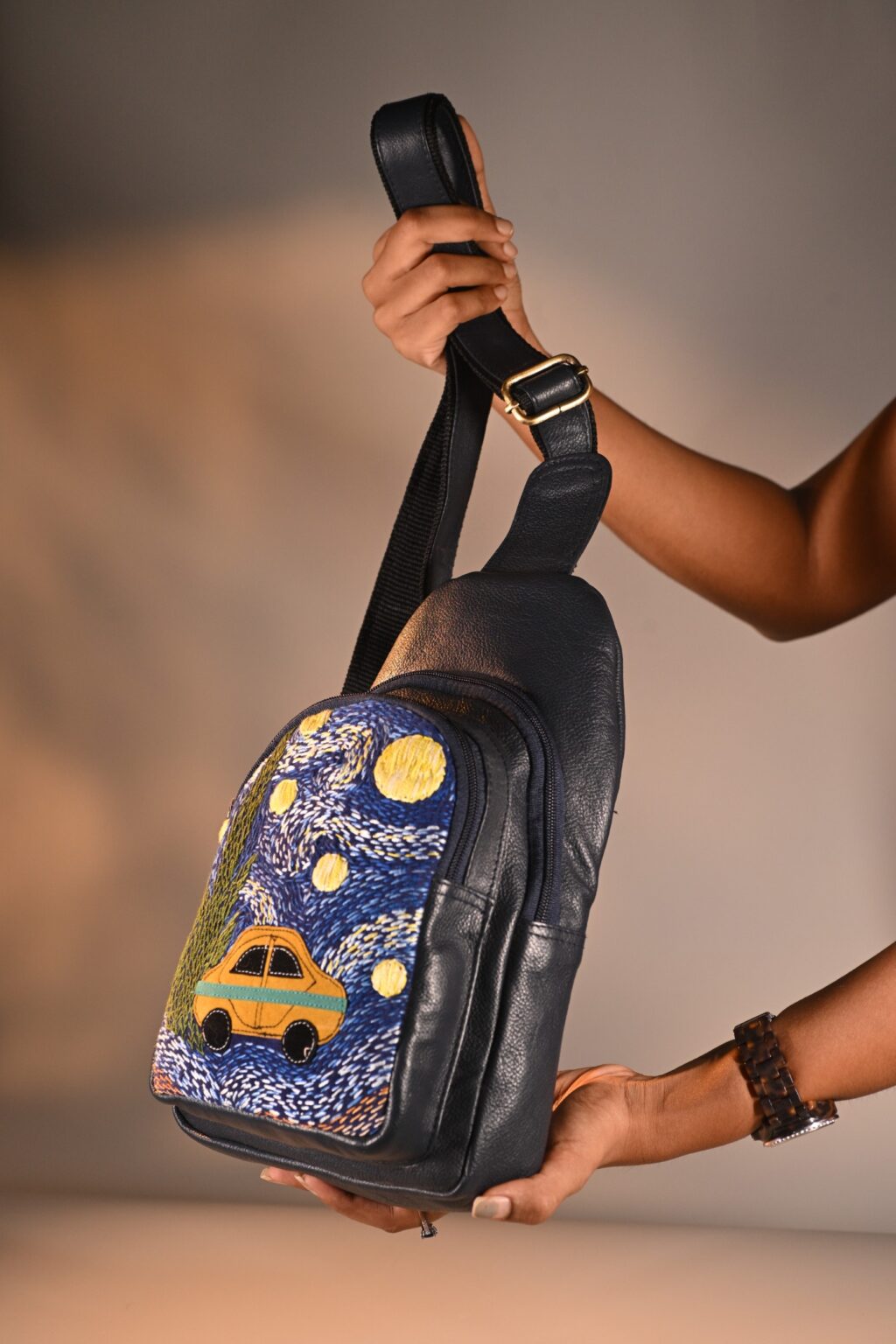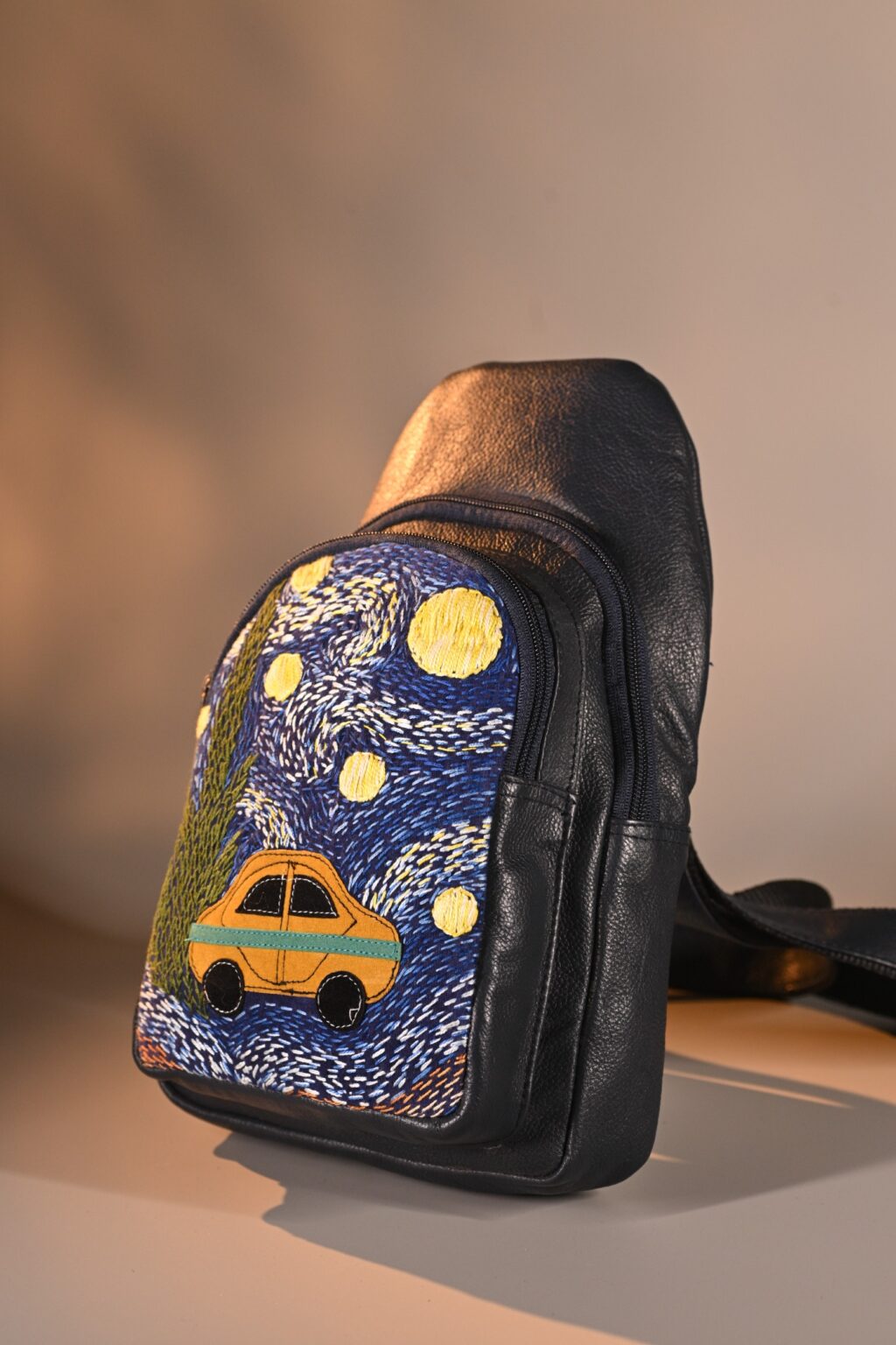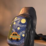This unique pure leather bag pack features a Van Gogh’s iconic Starry Night handembroidered artwork. Its spacious, compact design includes 1 zipper pocket, 1 inside zipper pocket, 1 outside front zipper pocket, 1 backside zipper pocket and space for essentials like your tablet, books, water bottle, umbrella and purse.