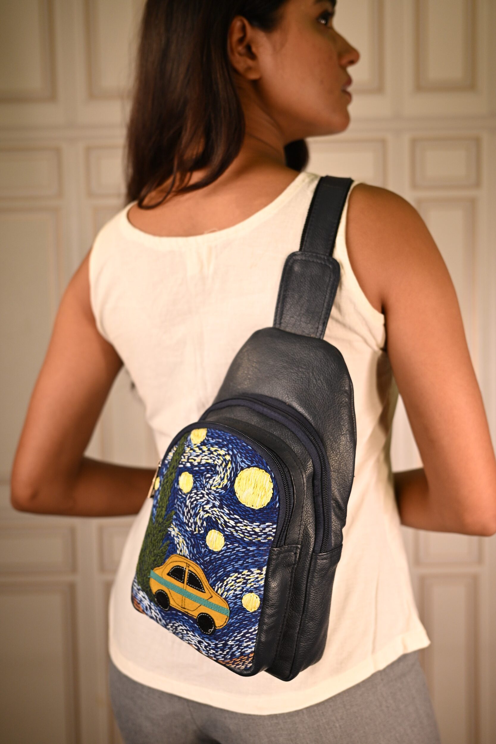 This unique pure leather bag pack features a Van Gogh’s iconic Starry Night handembroidered artwork. Its spacious, compact design includes 1 zipper pocket, 1 inside zipper pocket, 1 outside front zipper pocket, 1 backside zipper pocket and space for essentials like your tablet, books, water bottle, umbrella and purse.