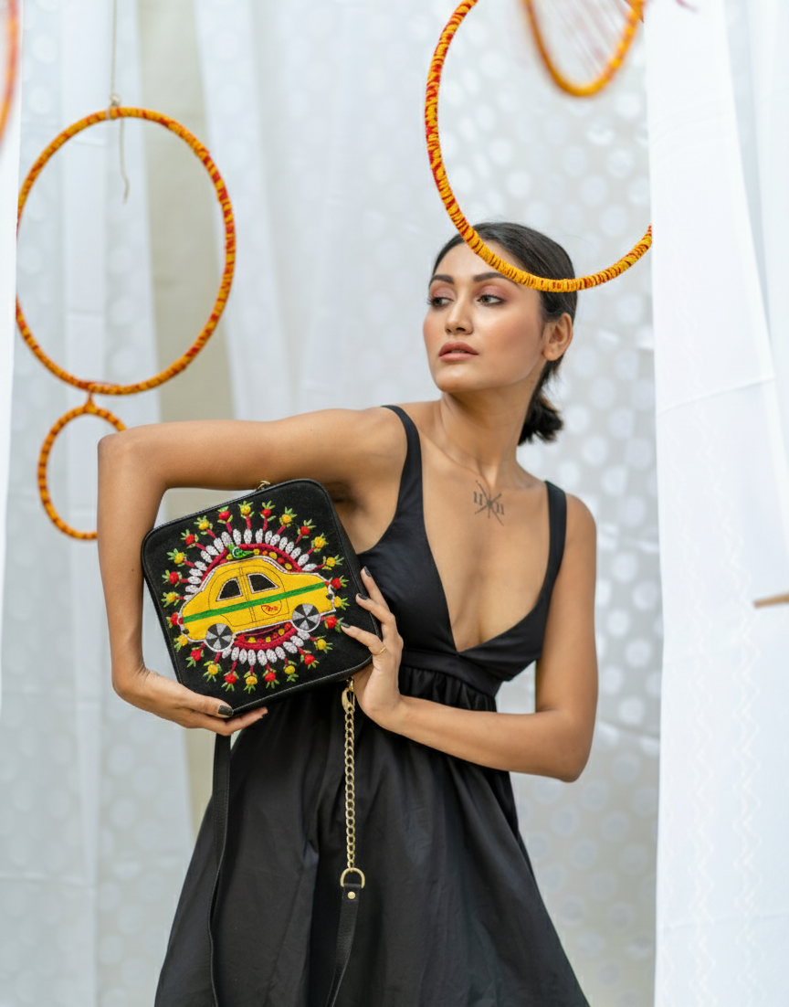 This unique sling bag features hand-embroidered artwork. Its sleek, compact design includes 1 zipper, 1 inside zipper pocket, 1 back zipper pocket and space for essentials like your phone, cosmetics, small umbrella, water bottle and cash. Equipped with a removable strap, it can be worn as a crossbody, shoulder bag, or clutch for any occasion.