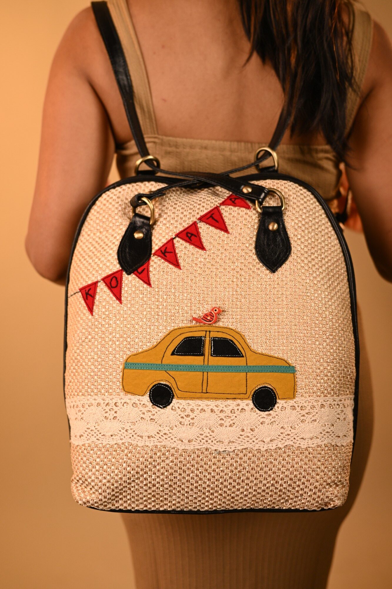 This unique pure leather bag pack cum sling design features hand-embroidered artwork. It’s a multiuse design for office and travel. Its spacious, compact design includes 1 all around zipper closure, 1 inside laptop compartment, 1 inside partition zipper pocket, and space for essentials like your laptop, books, water bottle, umbrella and purse. It can be worn as a handbag, sling bag, or a bag pack.
