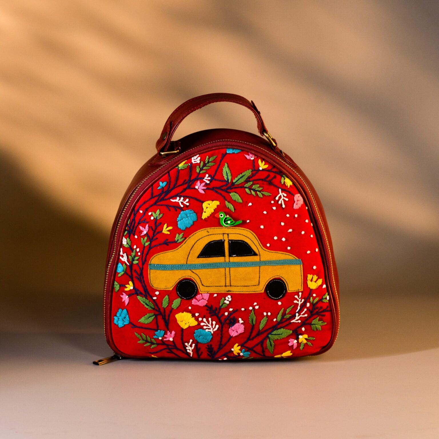 This unique sling bag features patchwork and hand-embroidered artwork. Its sleek, compact design includes 1 zipper, 1 inside zipper pocket, 1 back zipper pocket and space for essentials like your phone, cosmetics, small umbrella, water bottle and cash.