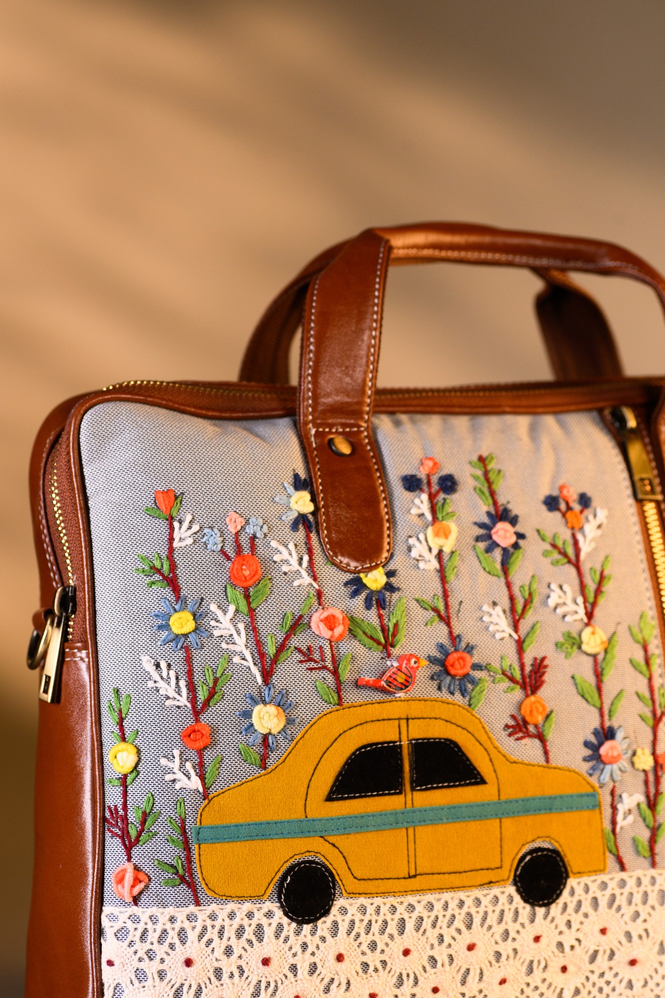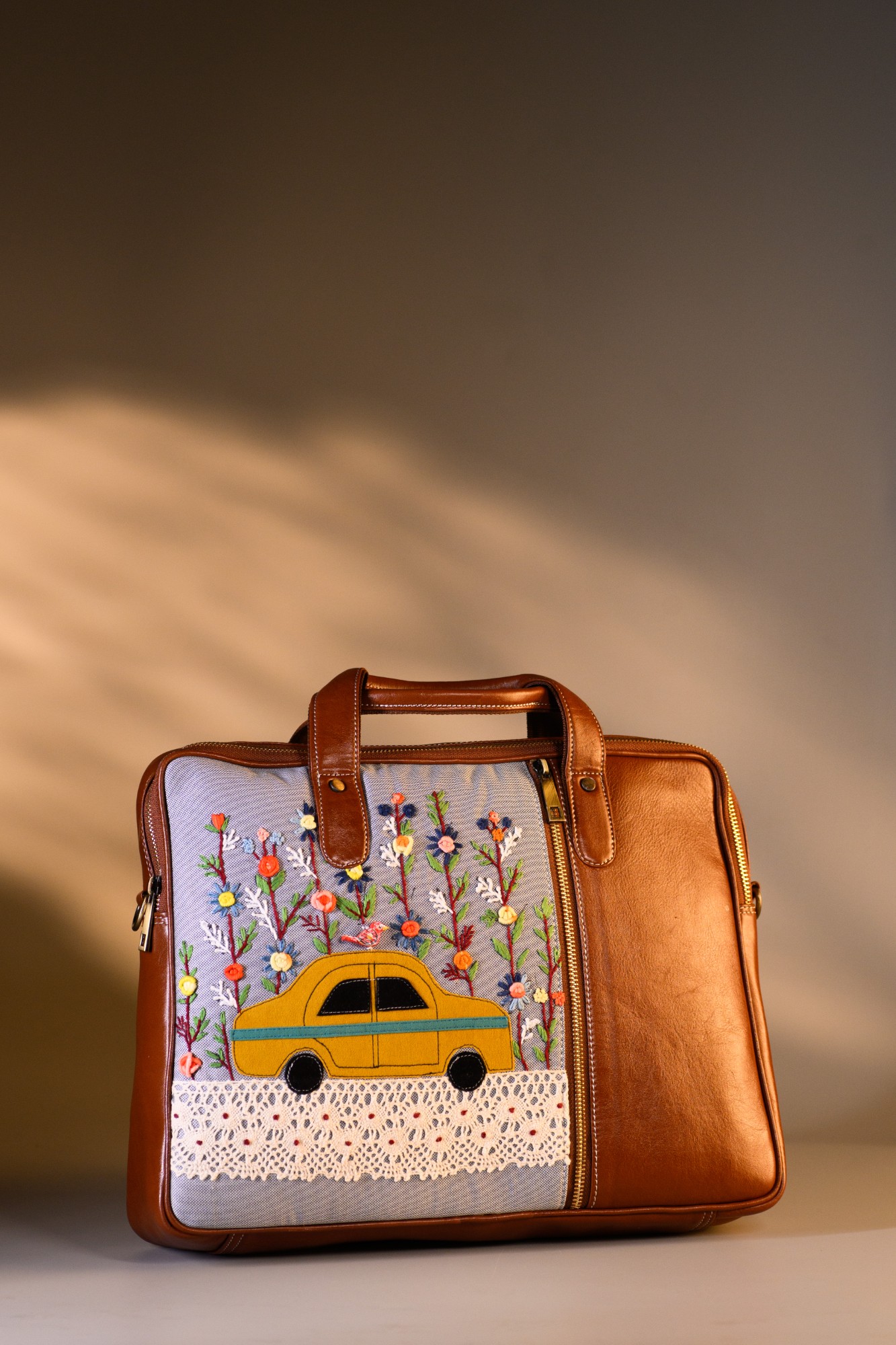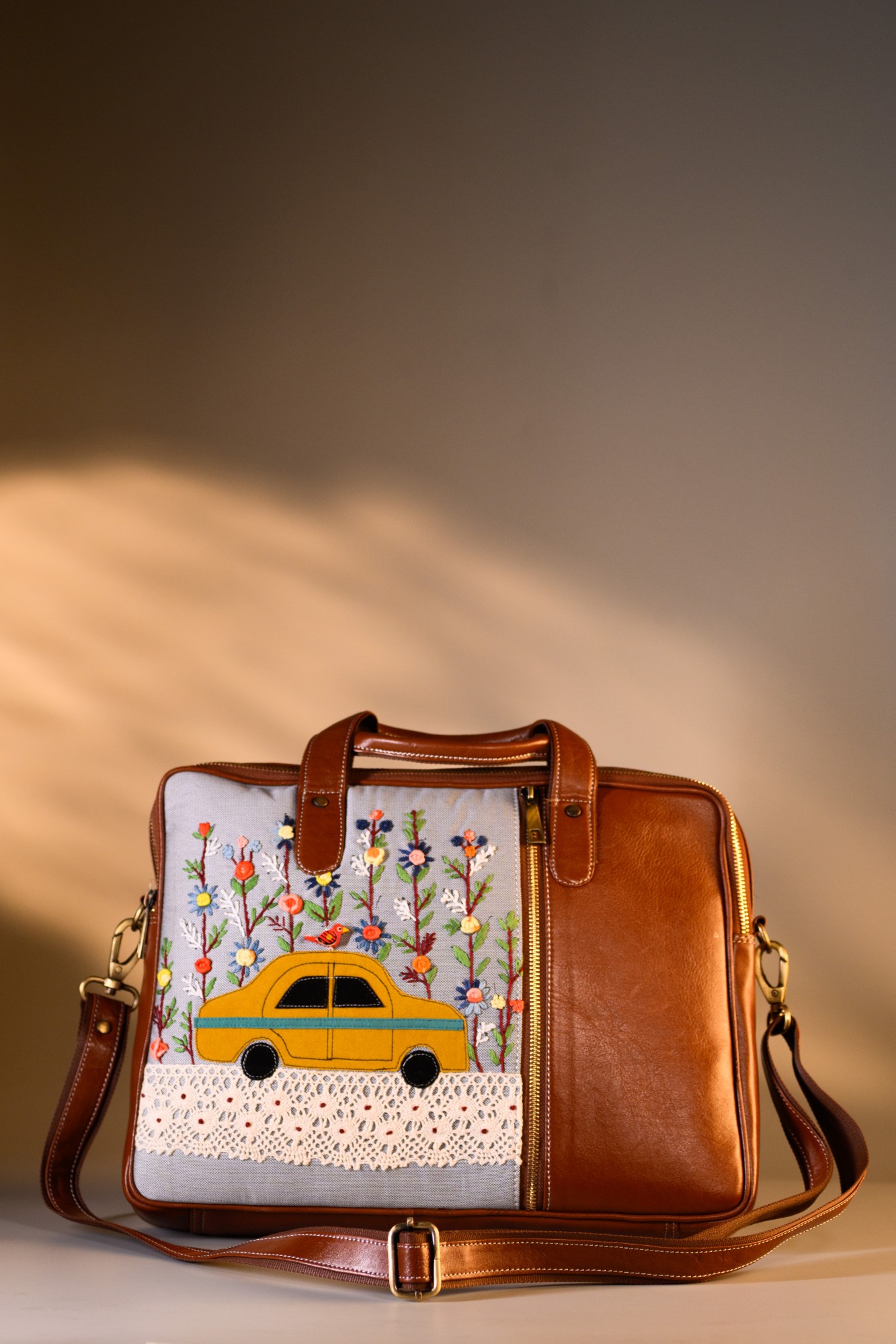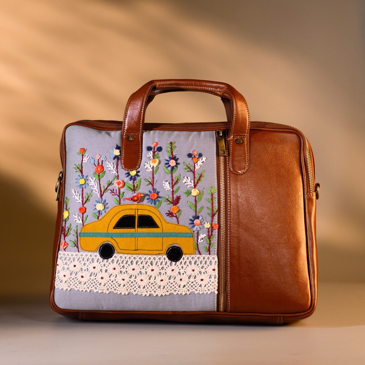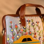 This unique laptop bag features yellow taxi in a colourful patch work and floral hand embroidery. Its sleek, compact design includes 1 main zipper, 1 inside zipper pocket, 1 outside zipper pockets in front, 1 back zipper pocket and space for essentials like your laptop, purse, tablet, notebooks and cash.